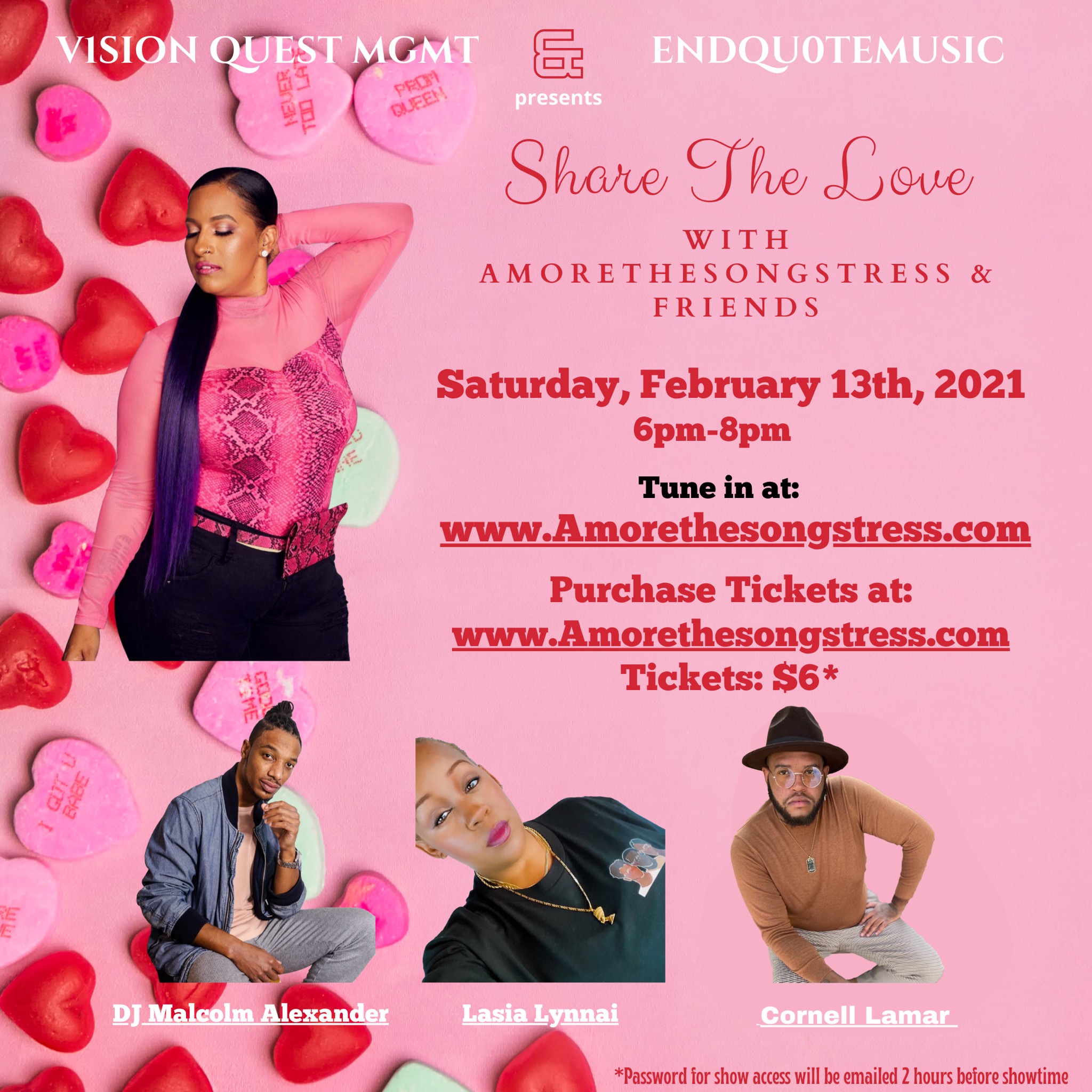 Saturday, February 13th at 6pm join Amoréthesongstress for a live virtual concert from the comfort of your home on the eve of Valentines Day! Joining Amoré will be the very talented spoken word artist Lasia Lynnai as well as local Inland Empire R&B artist Cornell Lamar.