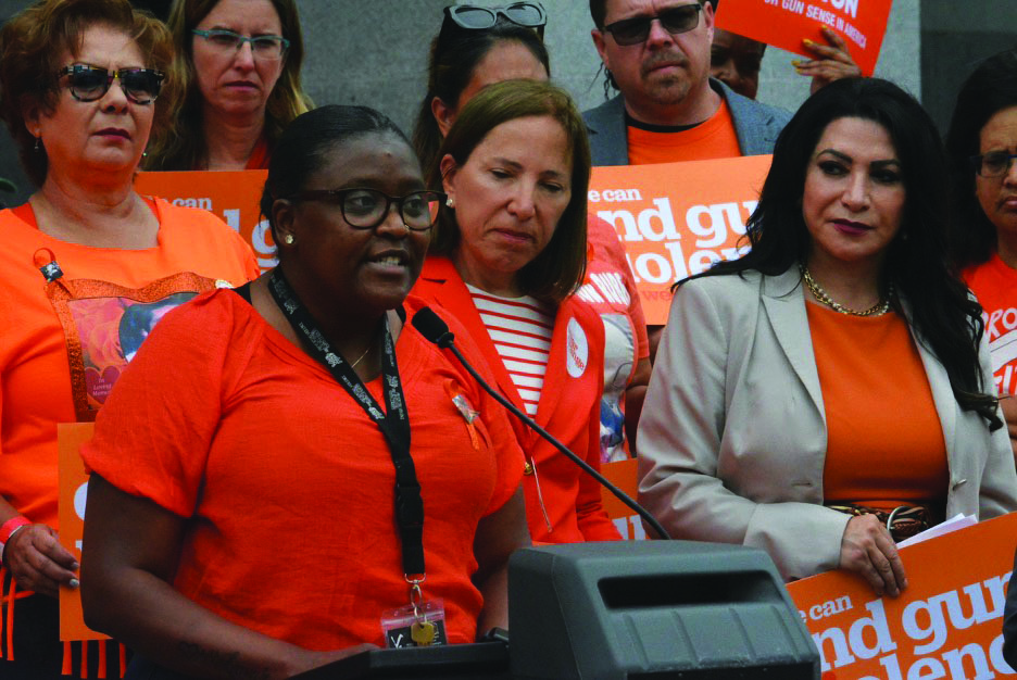 Lanisha Jones, left, who works for the Khadafy Washington Project Crisis Center in Oakland, shared that she lost three brothers to gun violence in the Bay Area. Shown with Jones at a gun prevention rally at the State Capitol in June 2024 is Lt. Gov. Eleni Kounalakis, center, and Sen. Susan Rubio (D-West Covina), right. CBM photo by Antonio Ray Harvey.